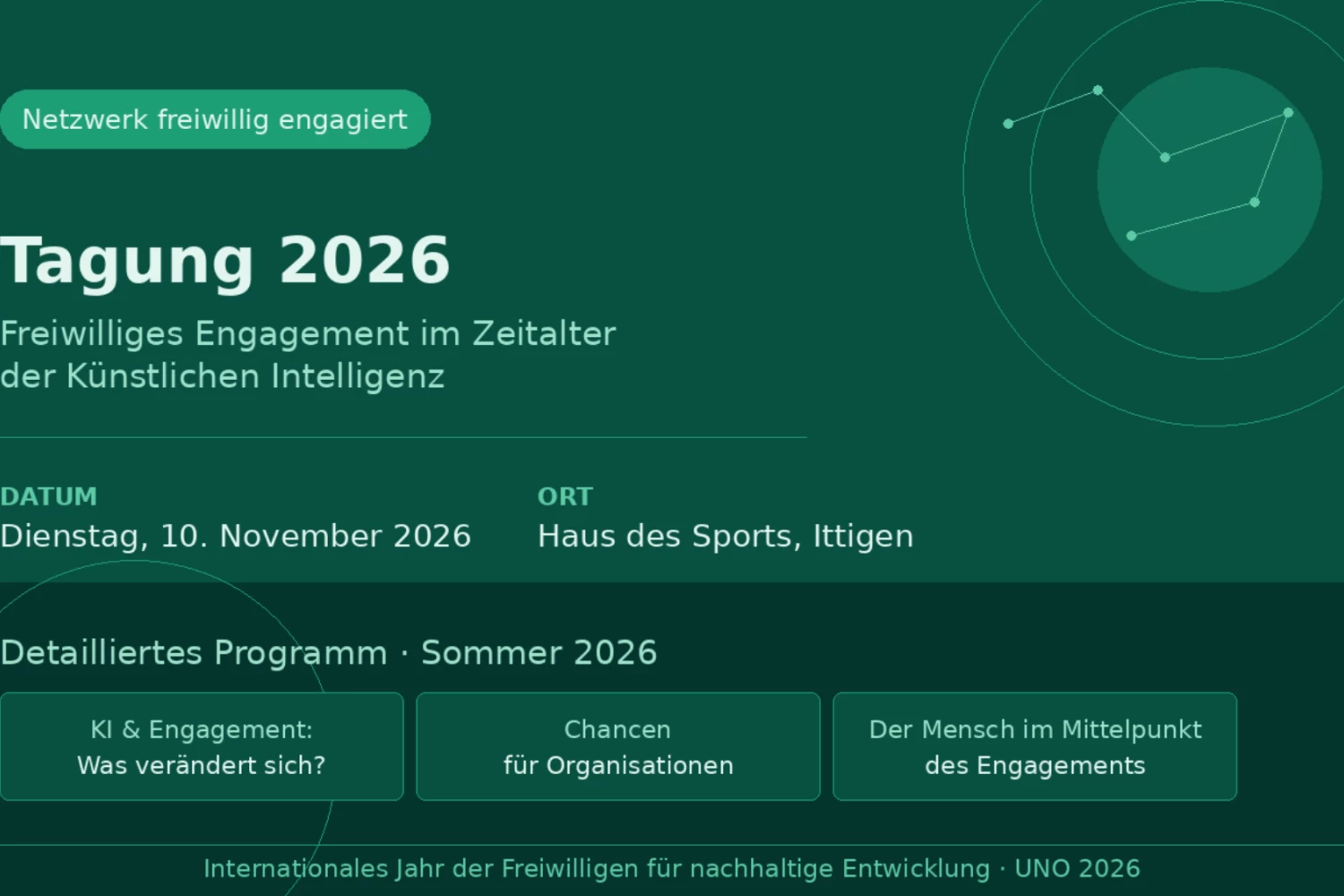 Am Dienstag, 10. November 2026 lädt das Netzwerk freiwillig engagiert zur Tagung ins Haus des Sports in Ittigen bei Bern ein. Nach einem Jahr Pause findet die Tagung wieder im grösseren Netzwerkrahmen statt. Sie bietet Raum für Austausch, neue Perspektiven und gemeinsame Diskussionen zur Zukunft des freiwilligen Engagements in einer zunehmend digital geprägten Welt.